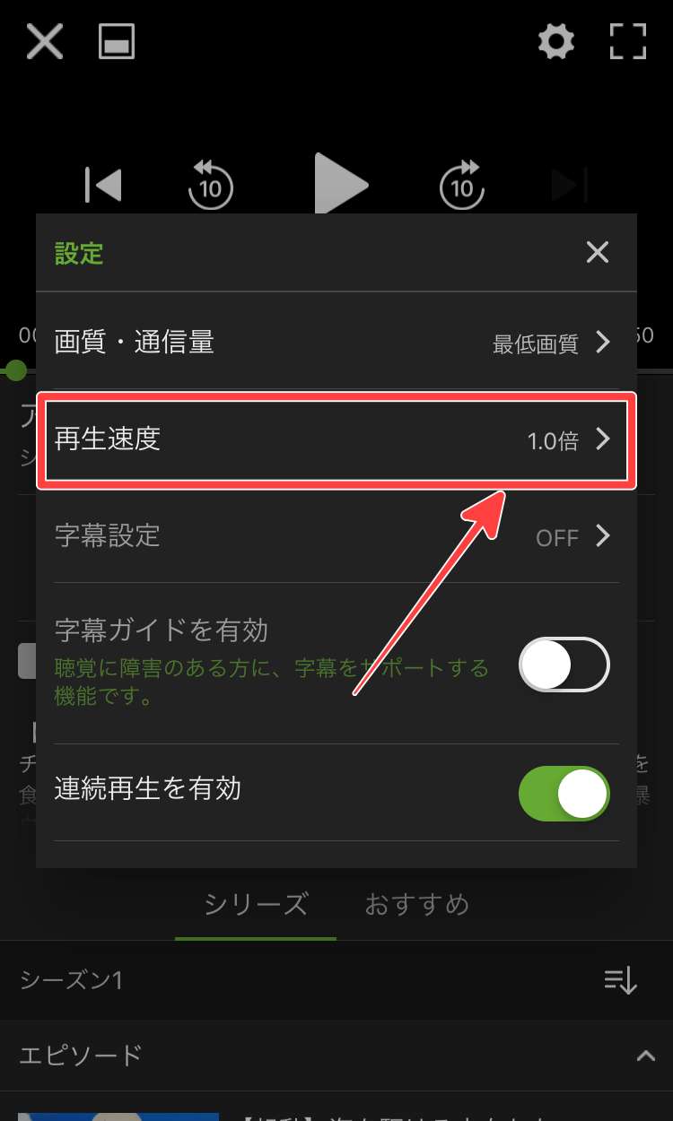「歯車」マークをタップすると設定画面が表示されますので、その中の「再生速度」をタップします。