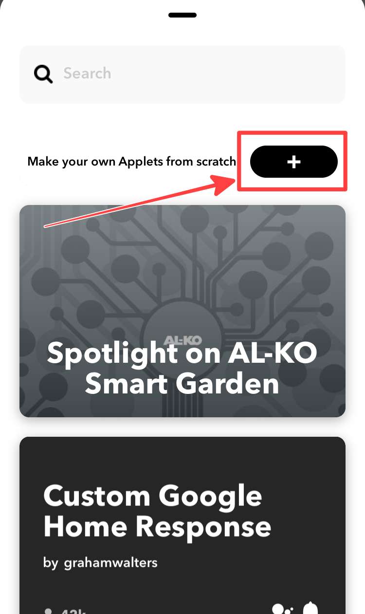 次の画面に変わったら一番下に表示されている「Go more」をタップすると以下の様な画面に変わりますので、「Make your own Applets from scratch」の隣の「+」をタップします。