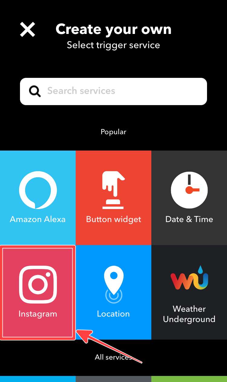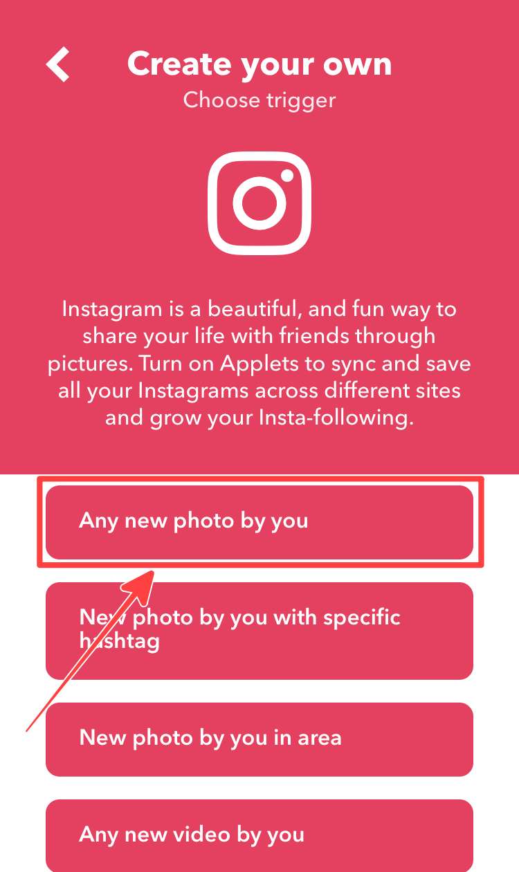 インスタグラムの認証が終わったら、以下の様な画面に変わりますので「Any new photo by you(あなたによる新しい写真)」をタップします。