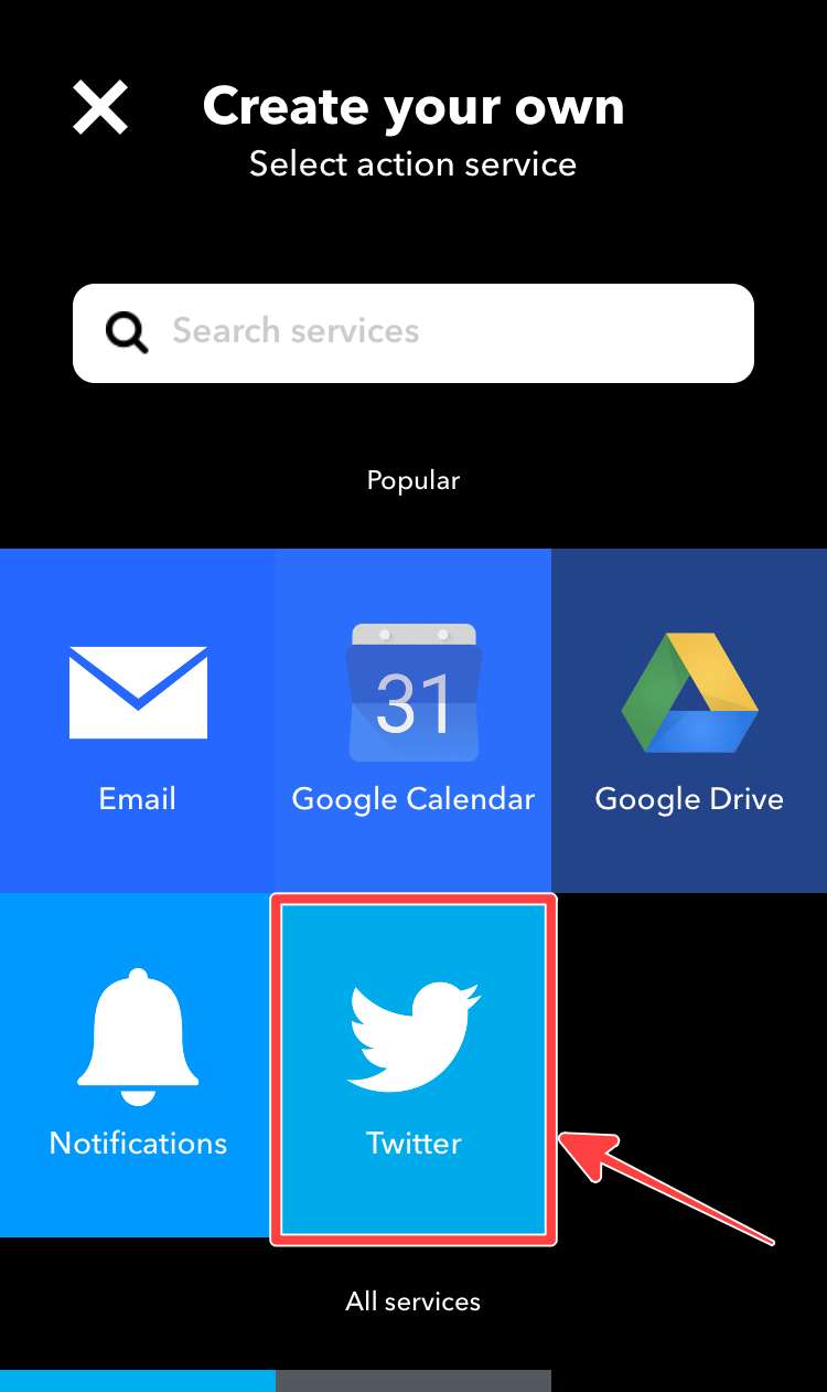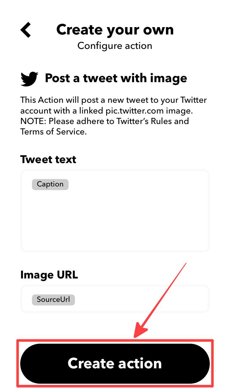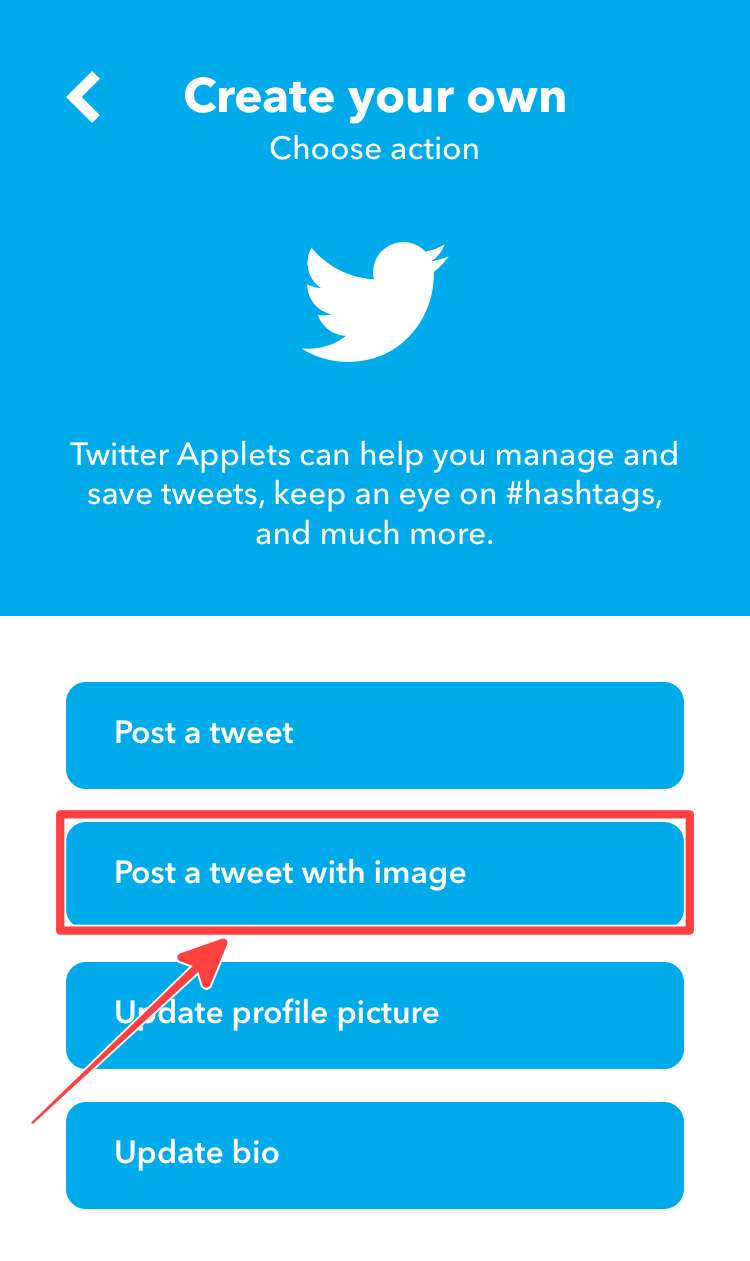 次に「Create your own」の画面でTwitterをタップし、「Post atweet with image(画像付きのツイート)」をタップします。