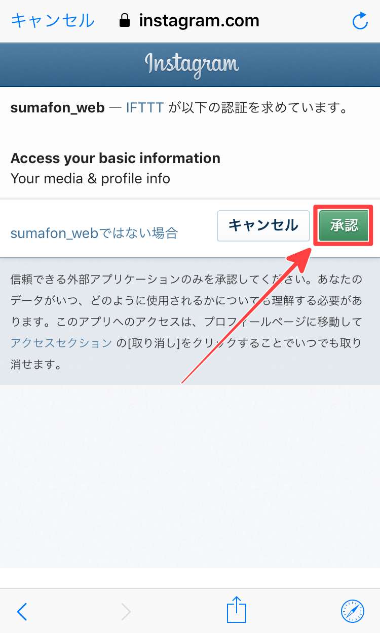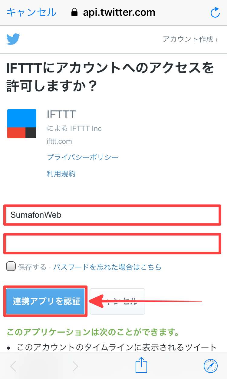 すると”IFTTTが認証を求めている”と言う表示がされますので問題なければ「認証」をタップします。