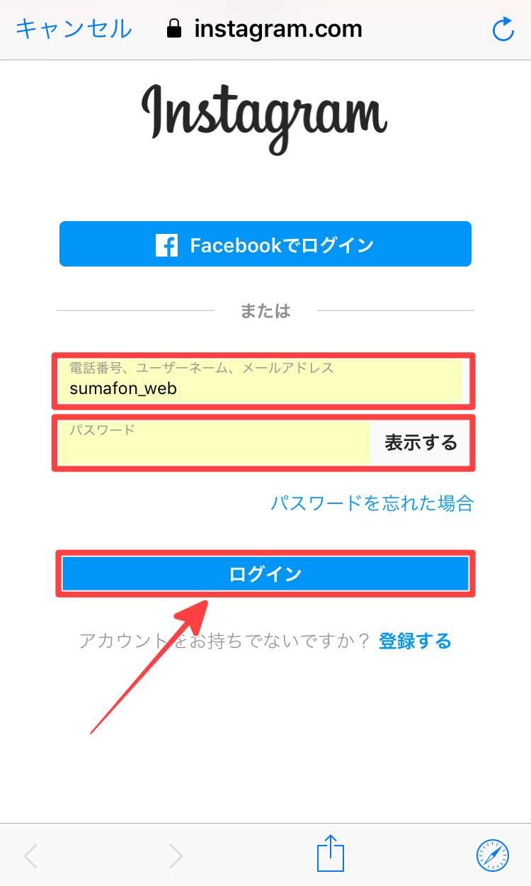 するとインスタグラムのログインを求められますので、「Facebookでログイン」もしくは、ログイン情報を入力してインスタグラムにログインします。