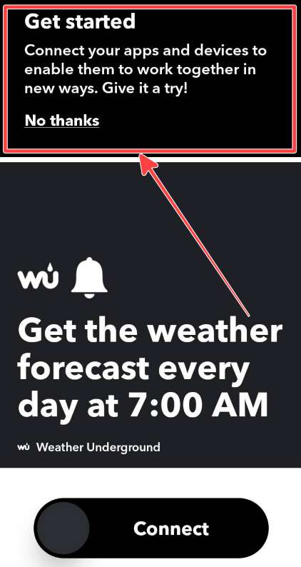 IFTTTにサインイン後は「Get standard」と書かれてある部分をタップします。一番下の「Connect」をスライドしてしまいがちですが、そこではなく「Get standard」と書かれてある部分をタップします。