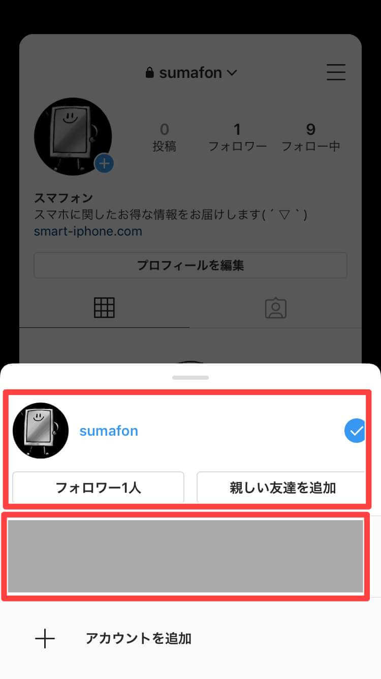 アカウントの切り替え方法は、プロフィール画面上部の「ユーザネーム」をタップすると、現在追加されているアカウント一覧が表示されます。