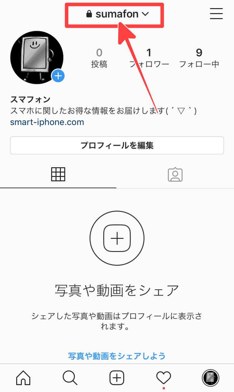 そしてもう一つのアカウント追加方法はプロフィール画面上部の「ユーザーネーム」をタップします。
