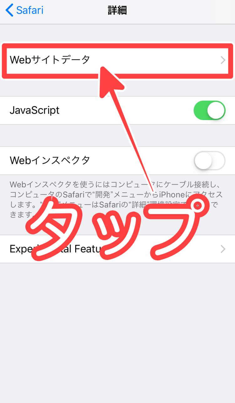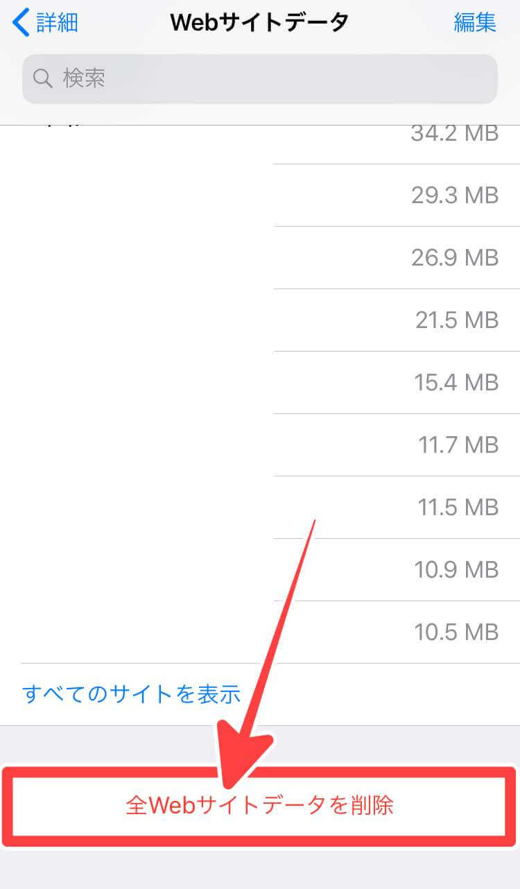 「設定アプリ」>「Safari」>「詳細」>「WEBサイトデータ」>「全WEBサイトデータを削除」をタップ