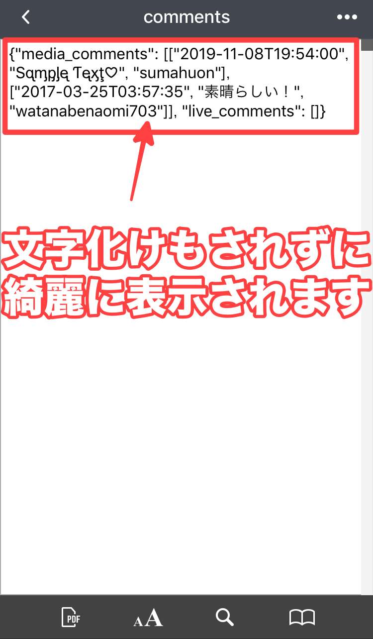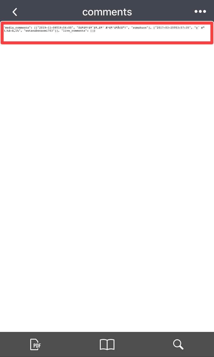 ちなみにパソコンでこれを表示した場合は、ファイルが「comments.json」と表示されていて、「comments.json」をタップすると、