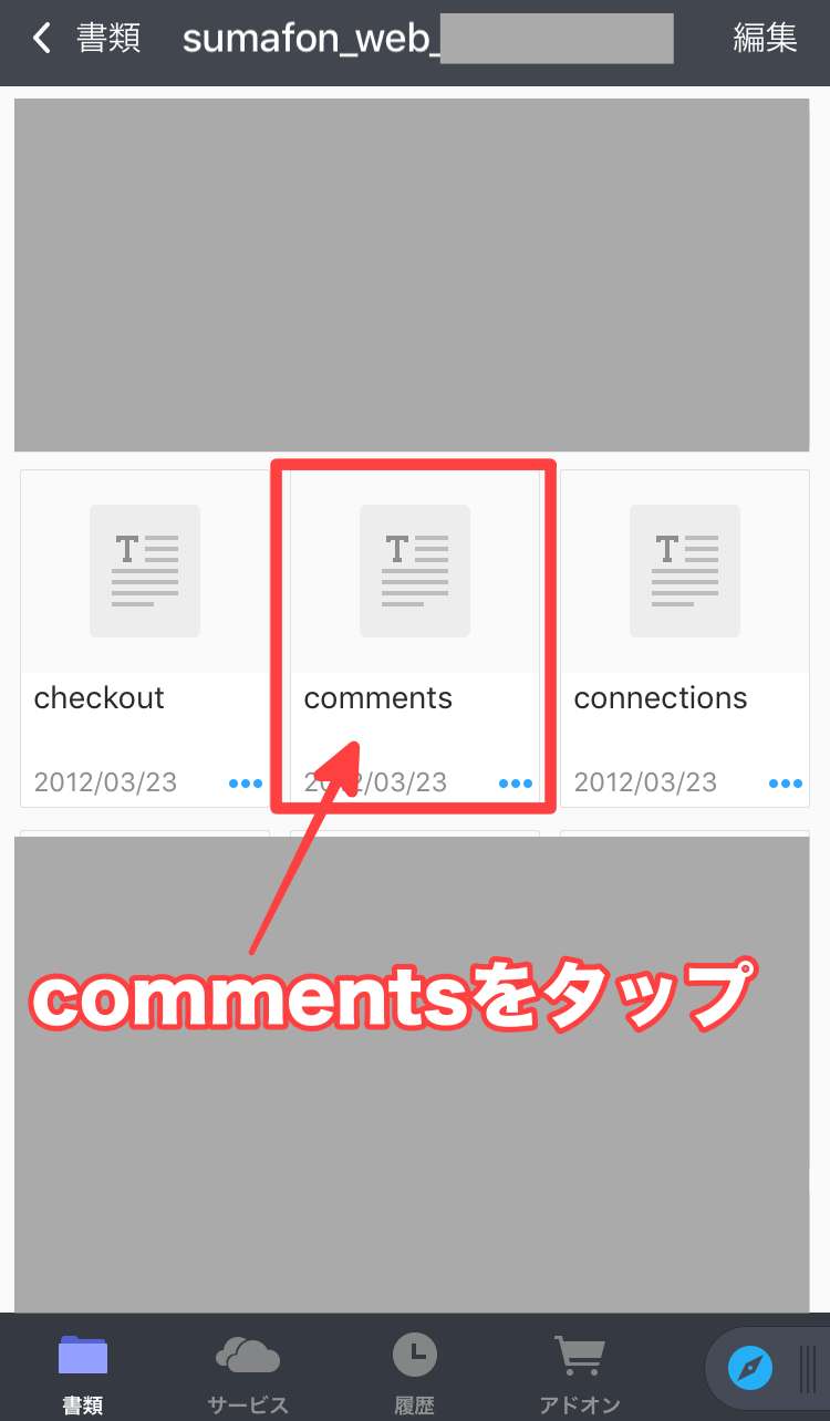 タップしたらファイルの中に「comments」と書かれたテキストデータがありますのでタップします。