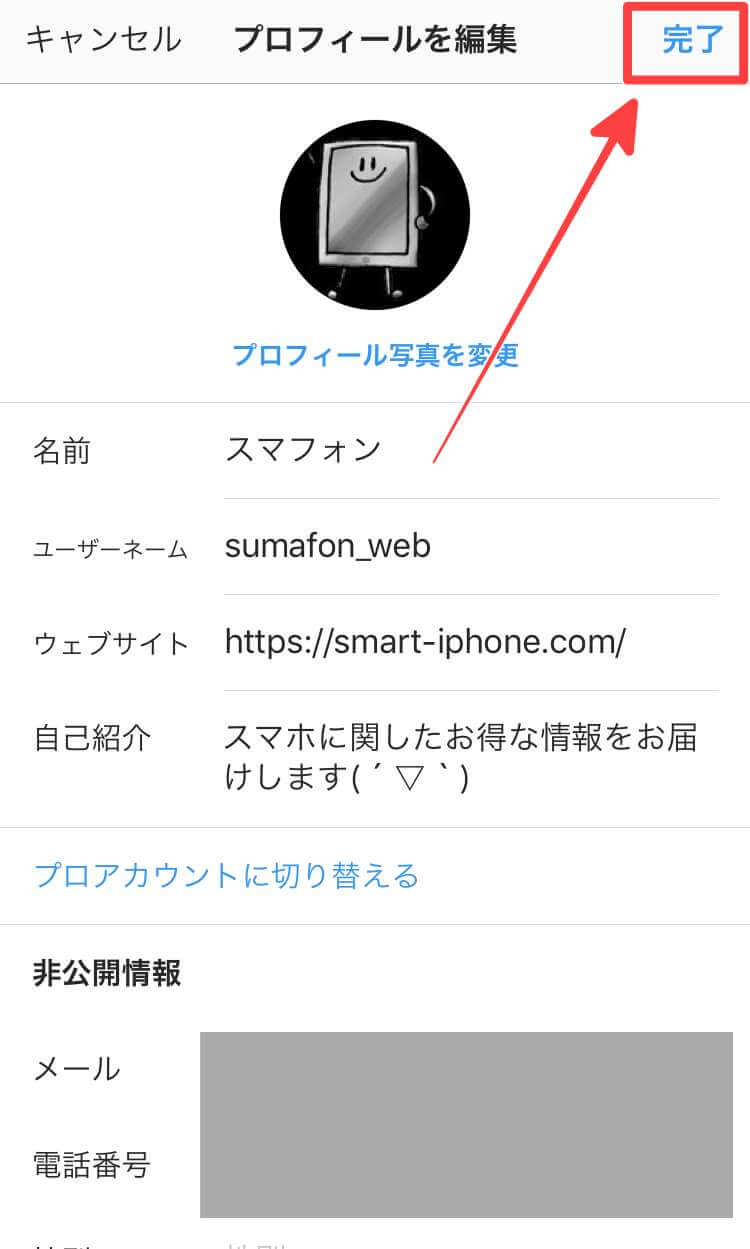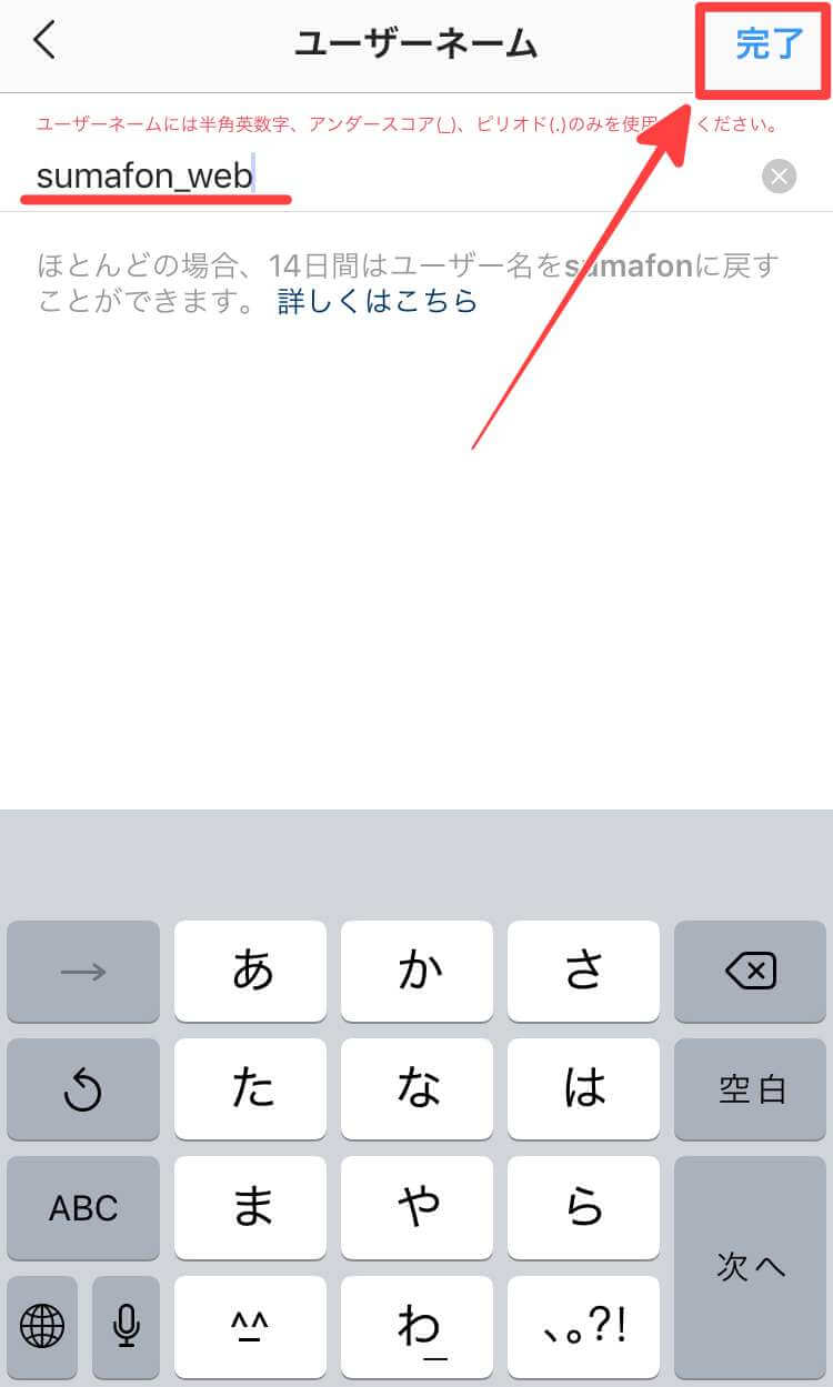 すると「プロフィールを編集」の画面が表示されますので、問題なければもう一度「完了」をタップすれば「ユーザーネーム」の変更設定は完了です。