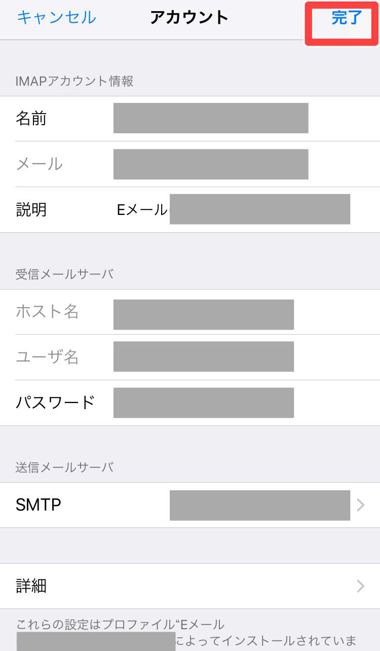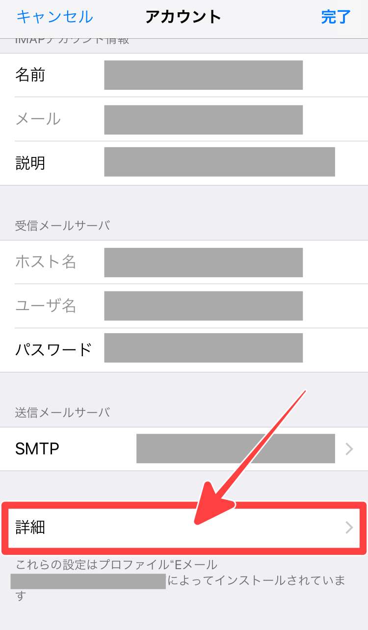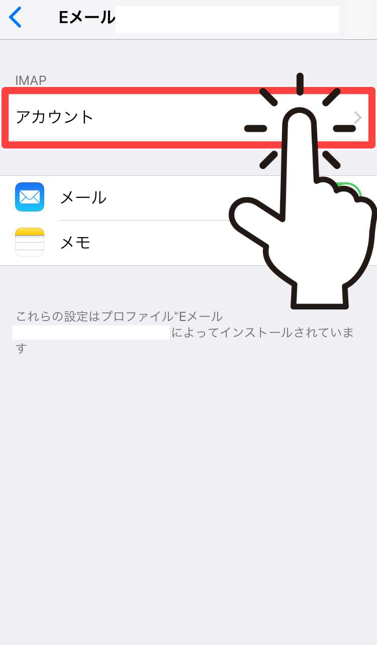 ③「IMAP」にある「アカウント」をタップ>「IMAPアカウント情報」を見て、誤りがないか確認します