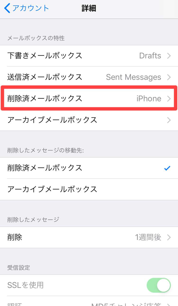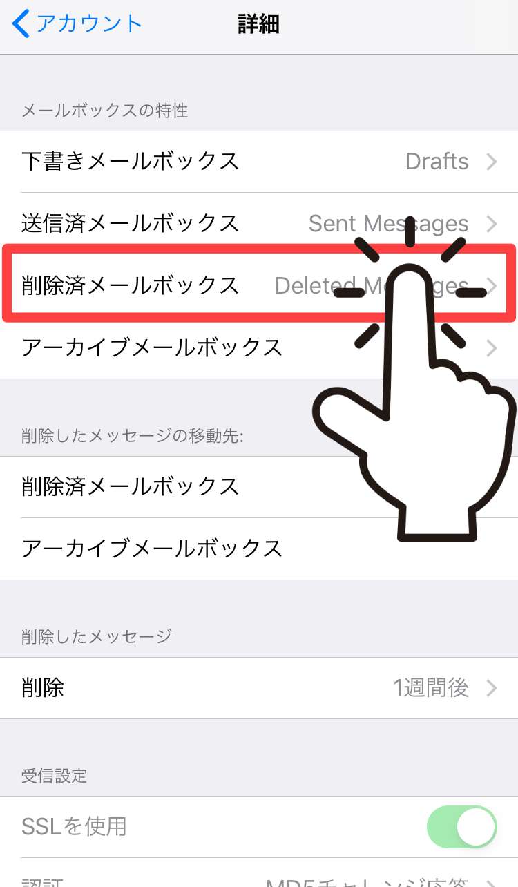 ①:先ほどの「IMAPアカウント情報」の一番下にある「詳細」をタップし、「メールボックスの特性」の「削除済みメールボックス」をタップします。