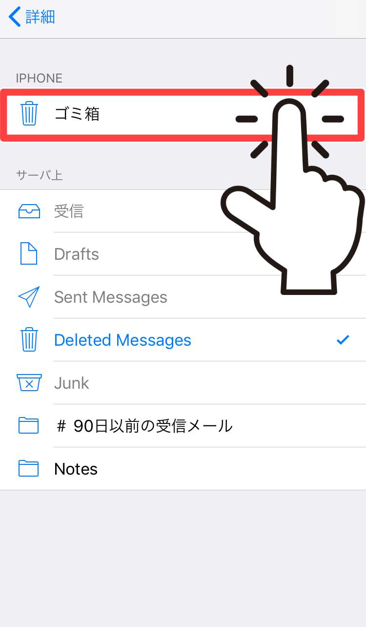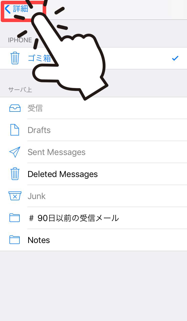 ②:「ゴミ箱」をタップして、左上の「詳細」をタップし、「削除済みメールボックス」が「iPhone」に設定されていることを確認します
