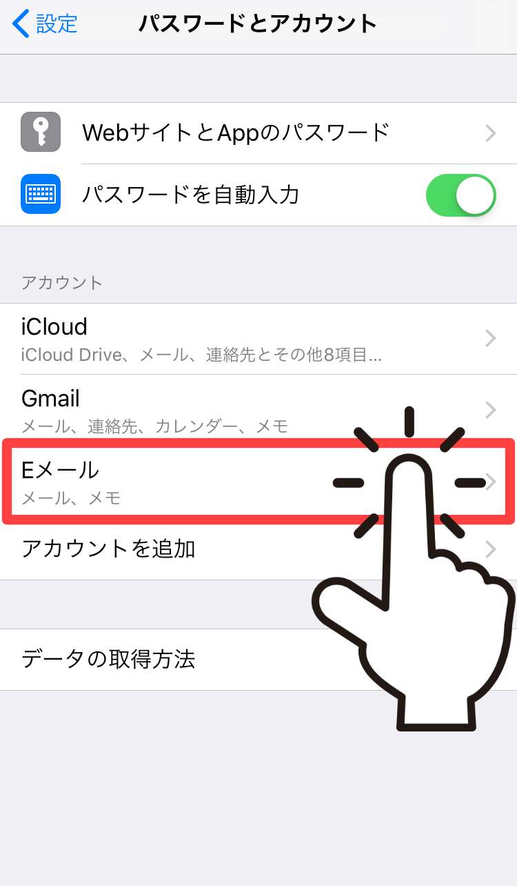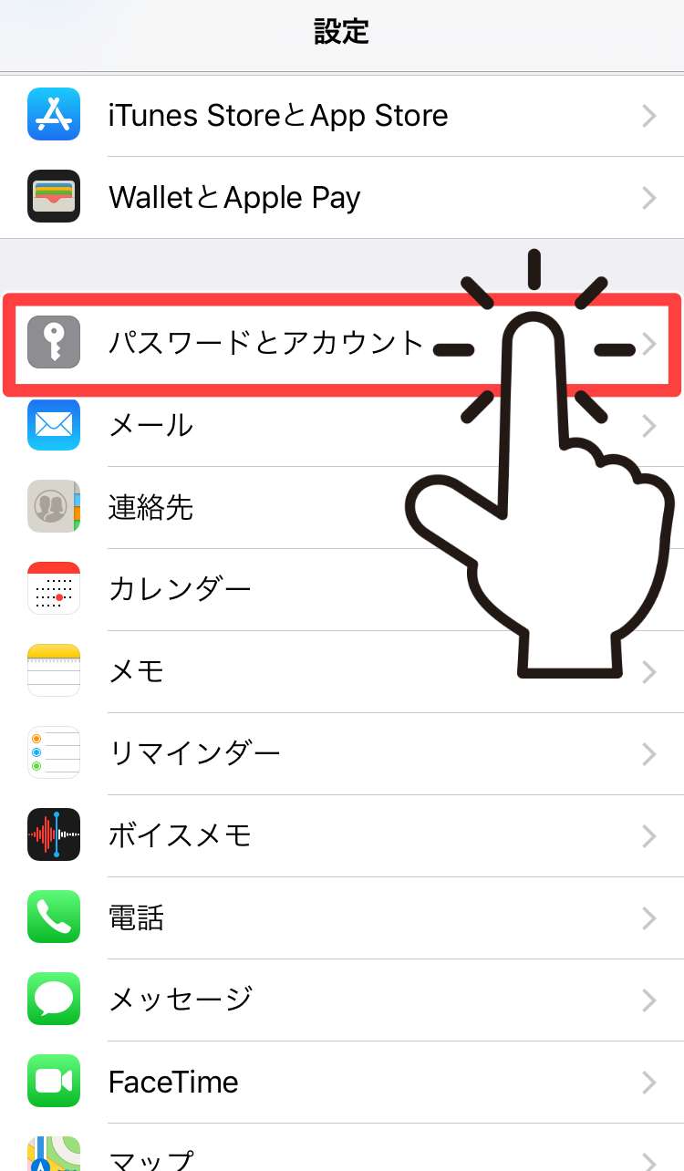①「設定」>「パスワードとアカウント」>削除したいメールの「アカウント」をタップします