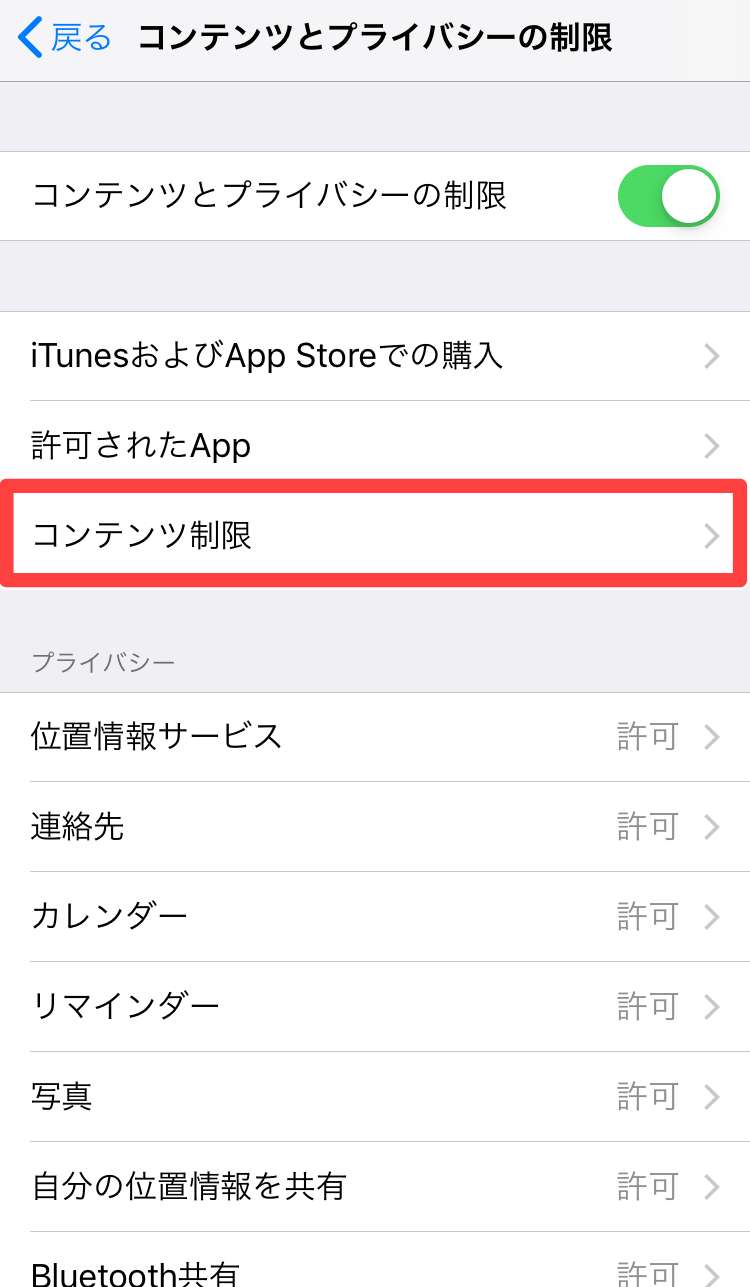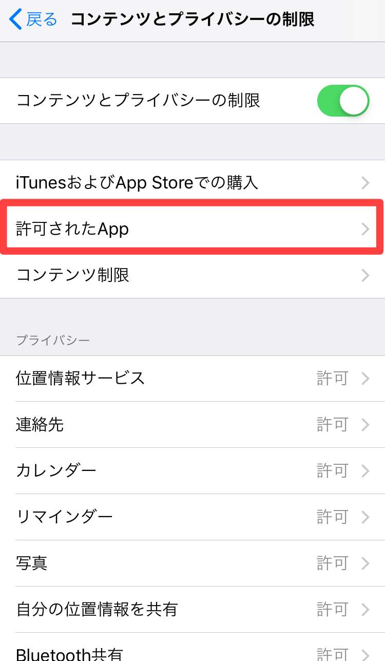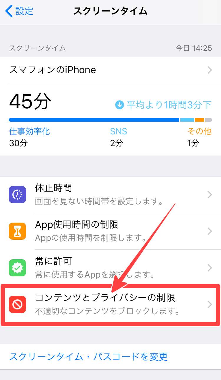 「設定」アプリ>「スクリーンタイム」>「コンテンツとプライバシーの制限」>「スクリーンタイム・パスコード」を入力します。