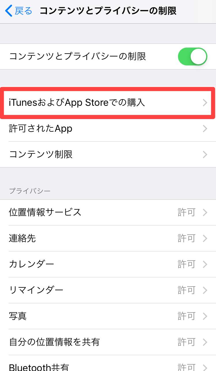 今回はiPhoneのアプリのアンインストールになりますので、「コンテンツとプライバシーの制限」の設定の中の「iTunesおよびAppStoreでの購入」をタップします。
