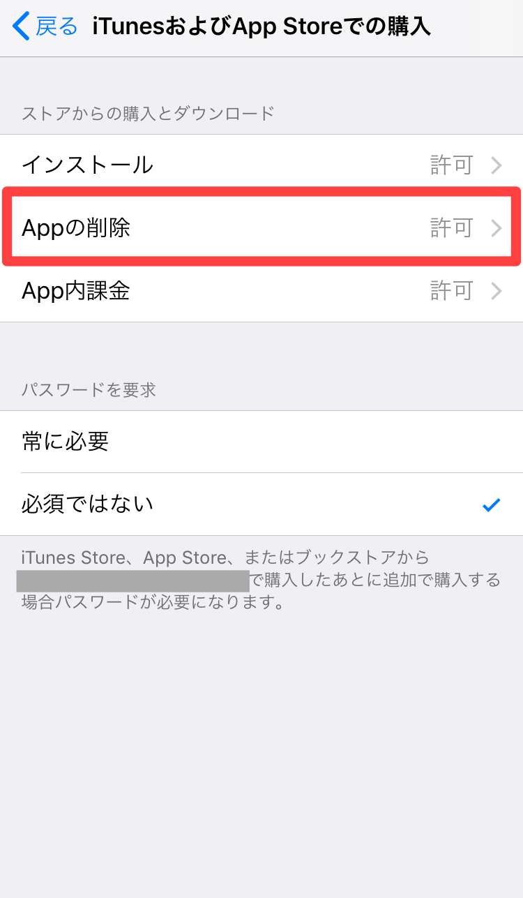 「iTunesおよびAppStoreでの購入」の項目の中に「Appの削除」という項目があるので、ここが「許可」になっているのかを確認します。