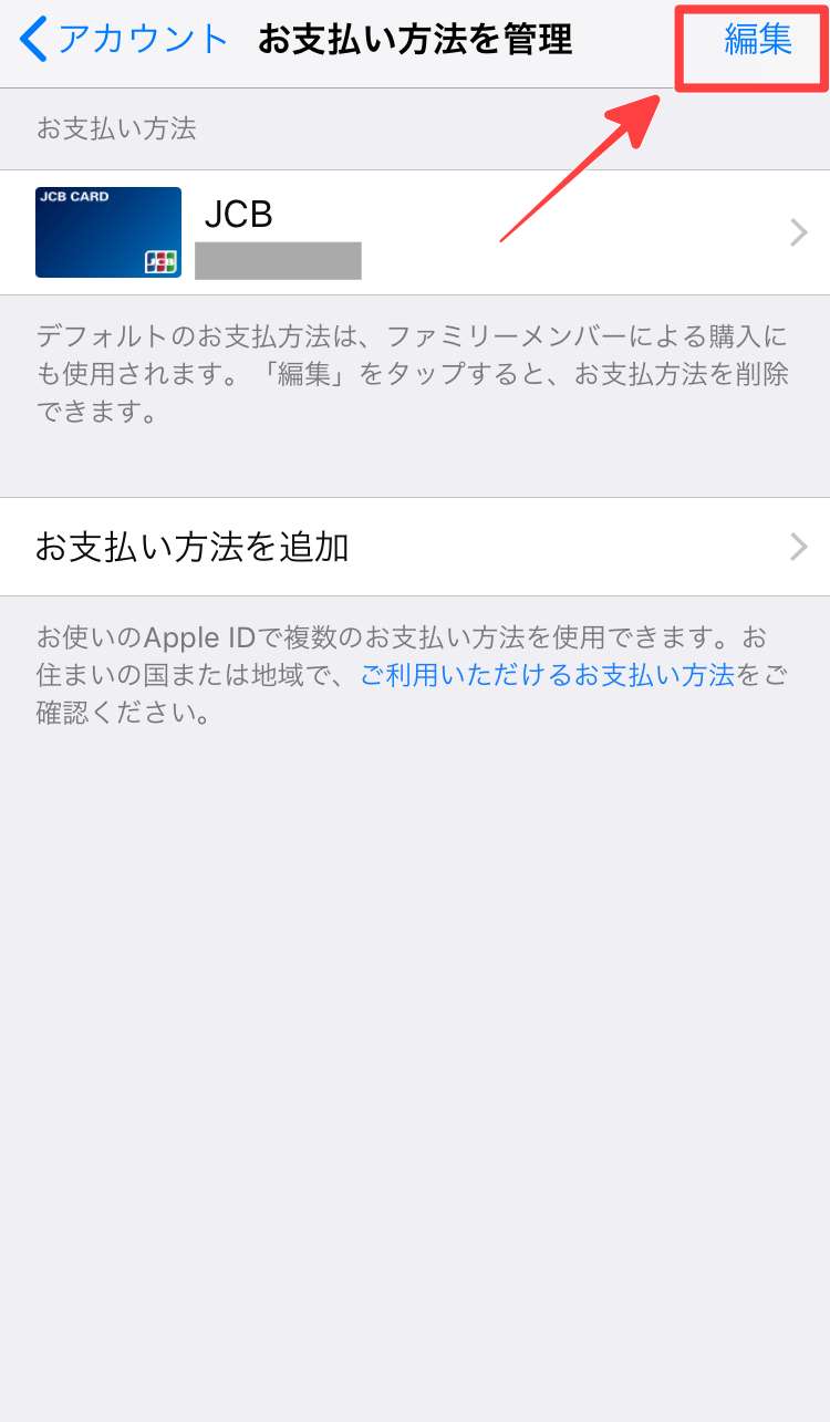 そしてiPhoneに登録してあるクレジットカード情報を削除したい場合は右上の「編集」をタップします。