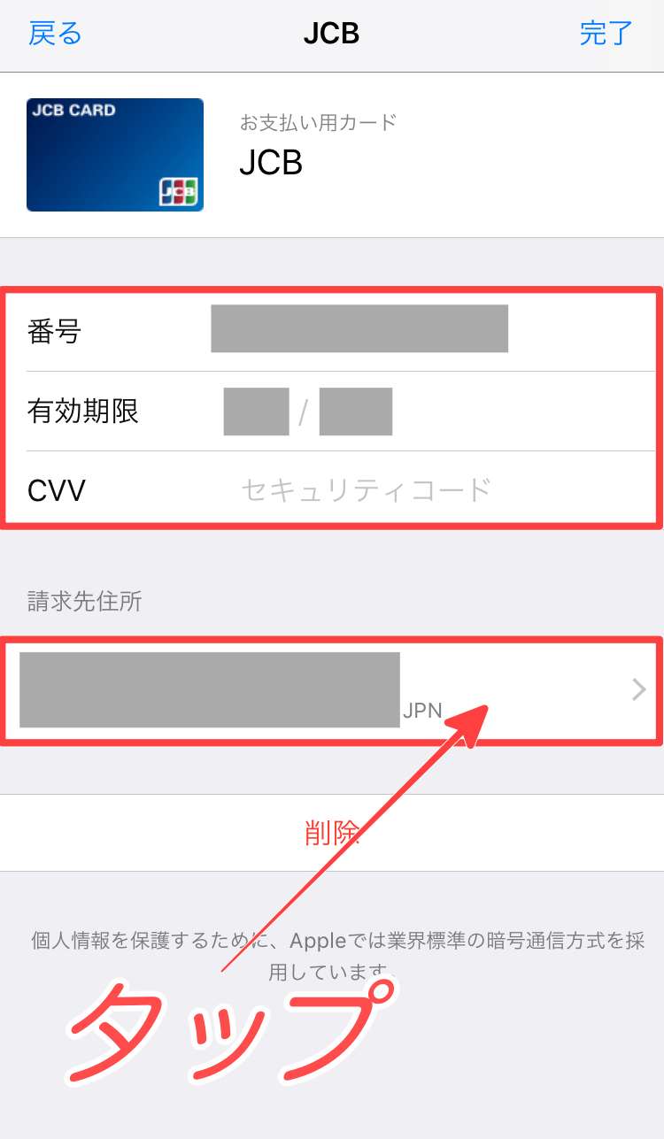 すると、iPhoneに登録してあるクレジットカードの情報を確認する事が出来ますので、修正する項目がある場合はここで修正します。