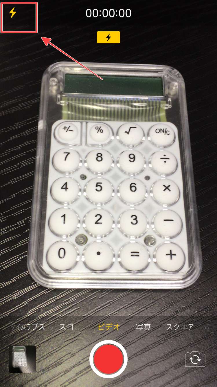 この時、「雷」マークをタップするとフラッシュライトが常時つけっぱなしの状態になります。