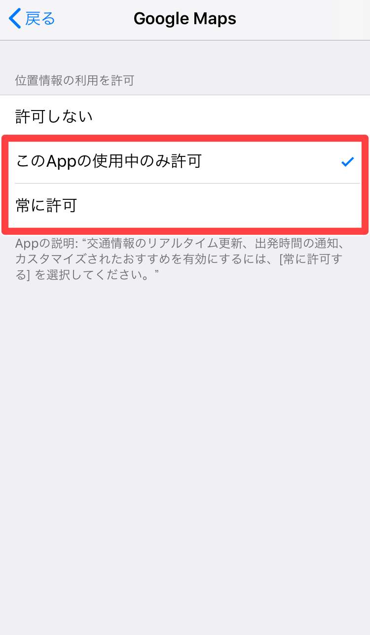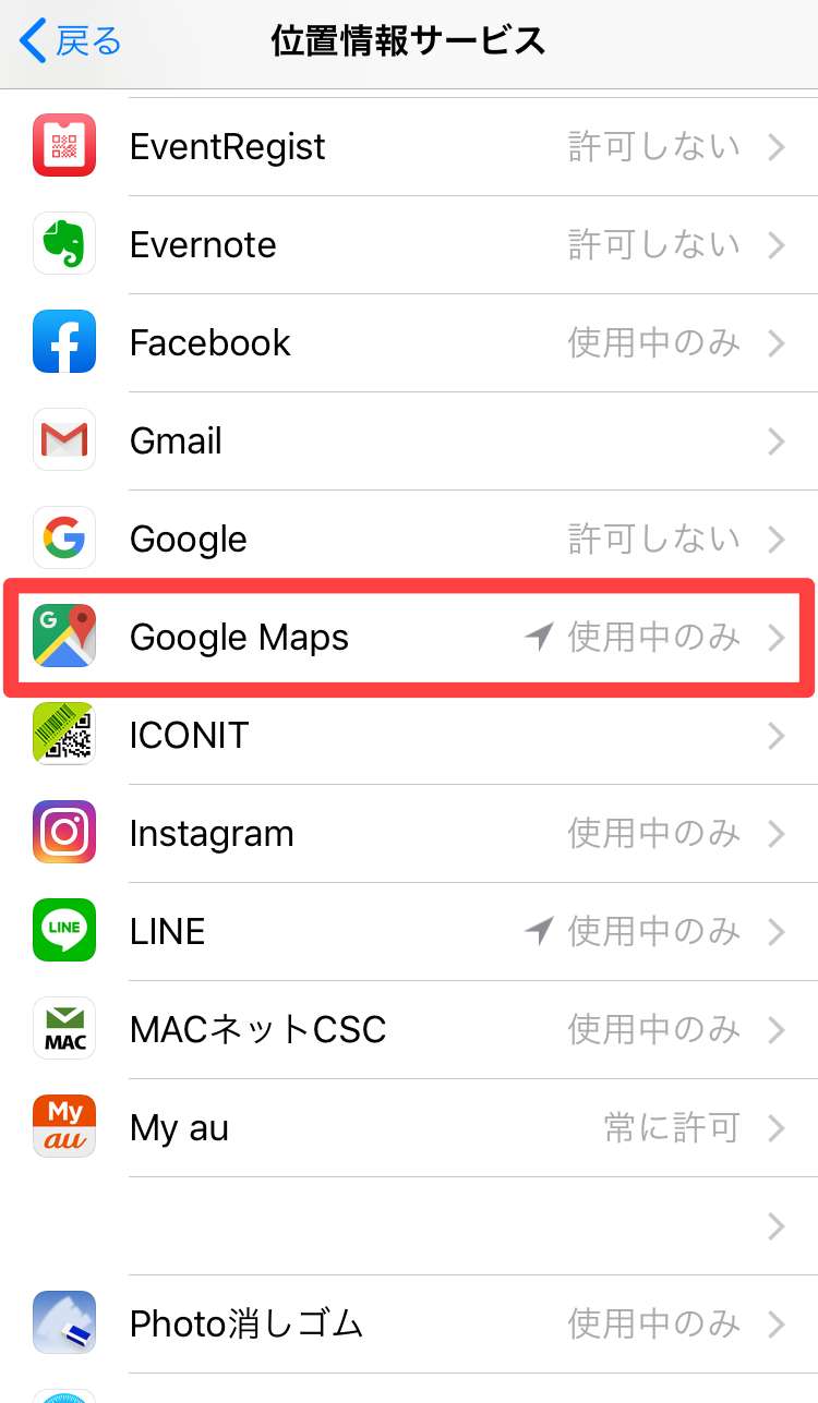 この設定でiPhoneの位置情報サービスの画面がグレーアウトとしていたものが、通常の画面に戻っているかと思います。