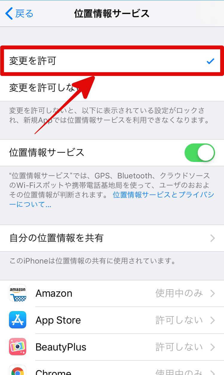 の順に進み、「変更を許可」をタップしてチェックします。