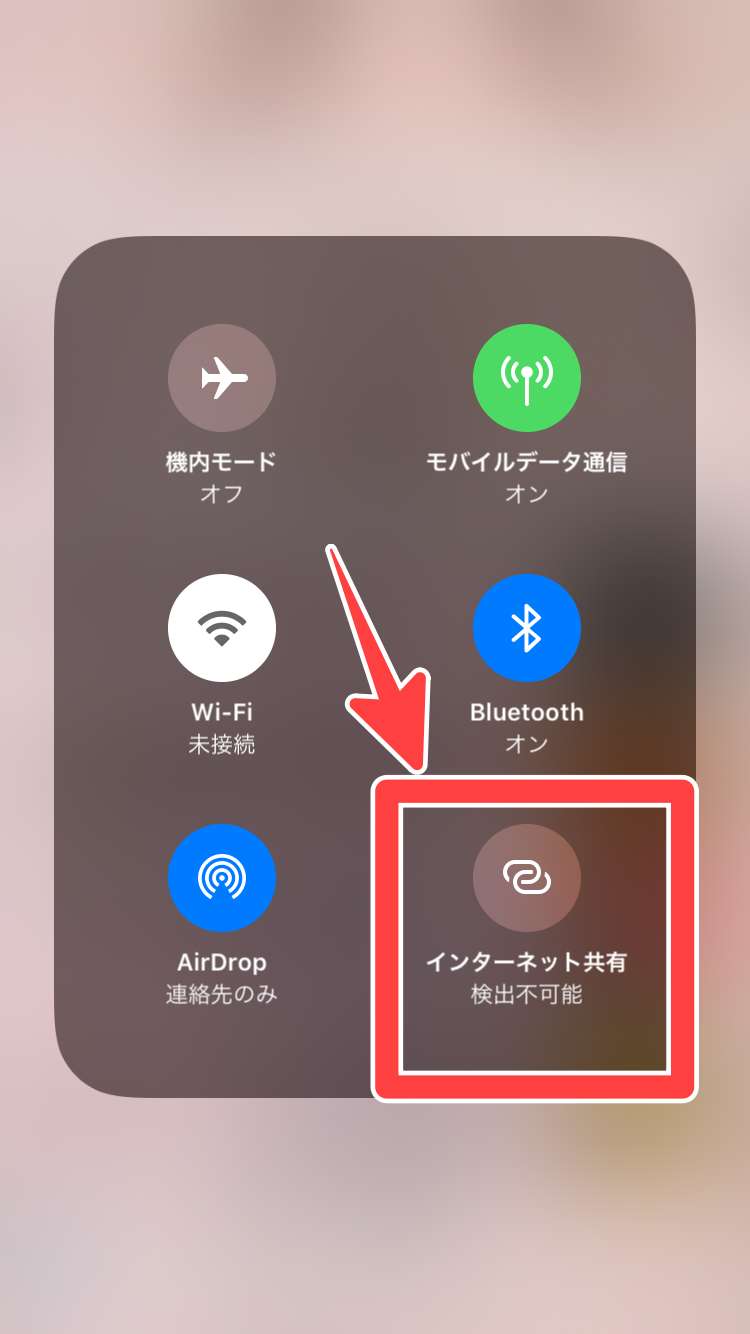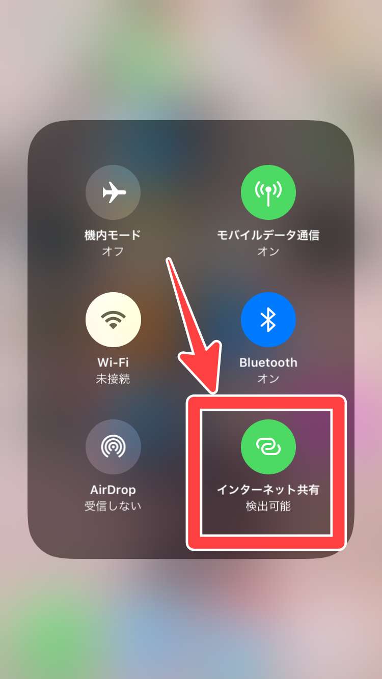 すると、そこに集約されていた項目が表示されますので、その中の「インターネット共有」をタップする事で「インターネット共有(テザリング)」が「オン」になって、iPhoneがテザリングできる状態になります。