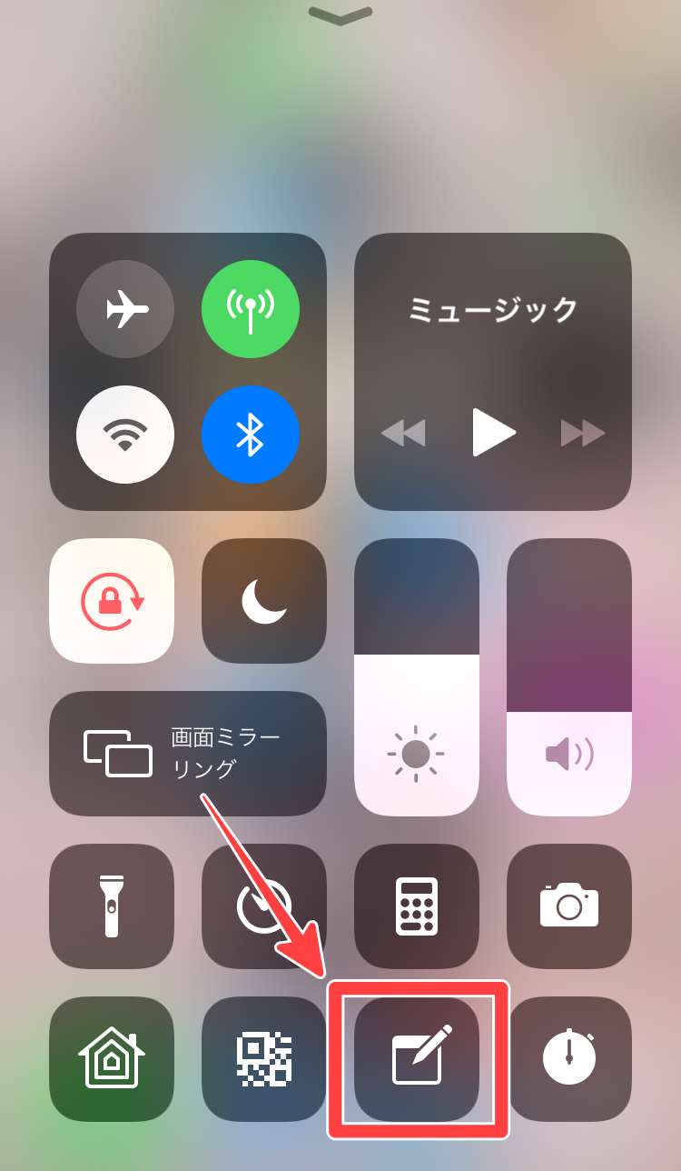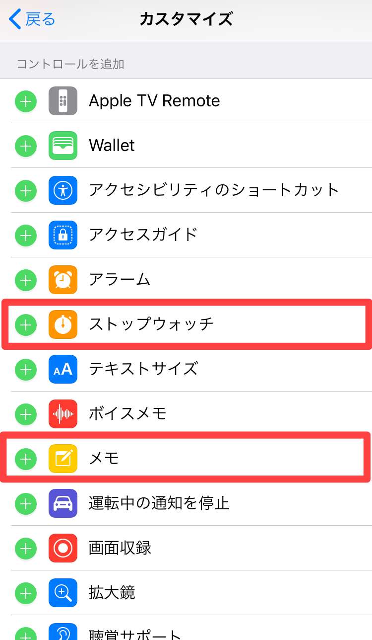 ここで一度「コントロールセンター」を開いてみると以下の様に「メモ」と「ストップウォッチ」が追加されています。