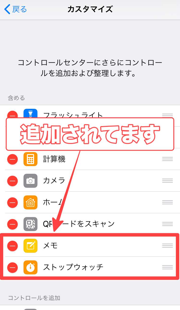 「コントロールを追加」の「メモ」と「ストップウォッチ」をタップするとこの様に「含める」の項目に移動します。