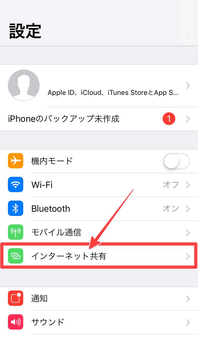 ①:iPhoneの「インターネット共有」が「オン」になっているかの確認