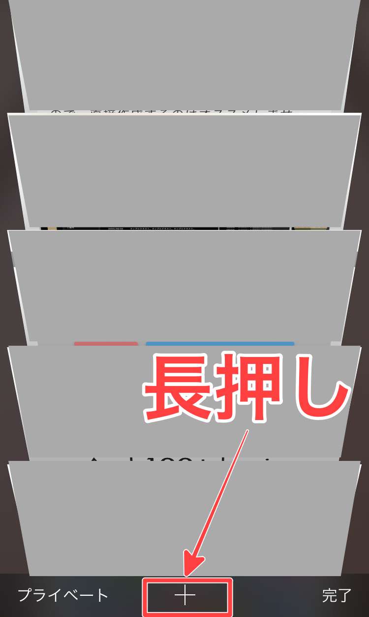 まず初めにSafariを起動したら右下に表示されている「タブ」マークをタップすると、マルチタスク画面が表示されますので、下のバーにある「+」を長押しします。