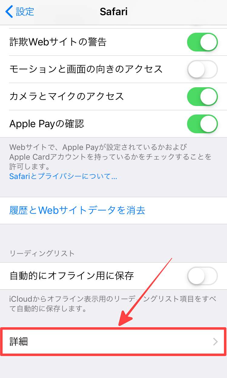 まず初めに「設定」アプリを起動したらつぎに「Safari」をタップし、次の画面の一番下に「詳細」と書かれてあるのでこちらをタップします。