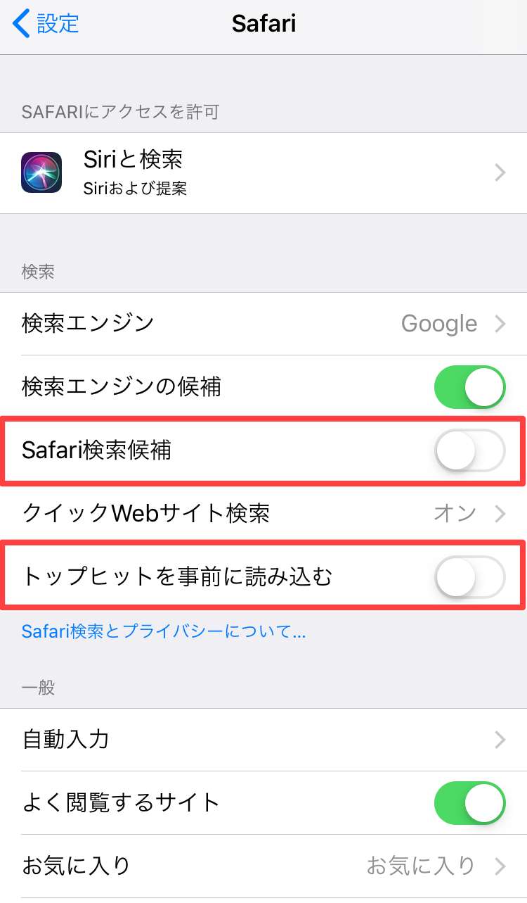 次に「Safari検索候補」、「トップヒットを事前に読み込む」を「オフ」にします。