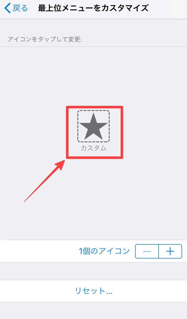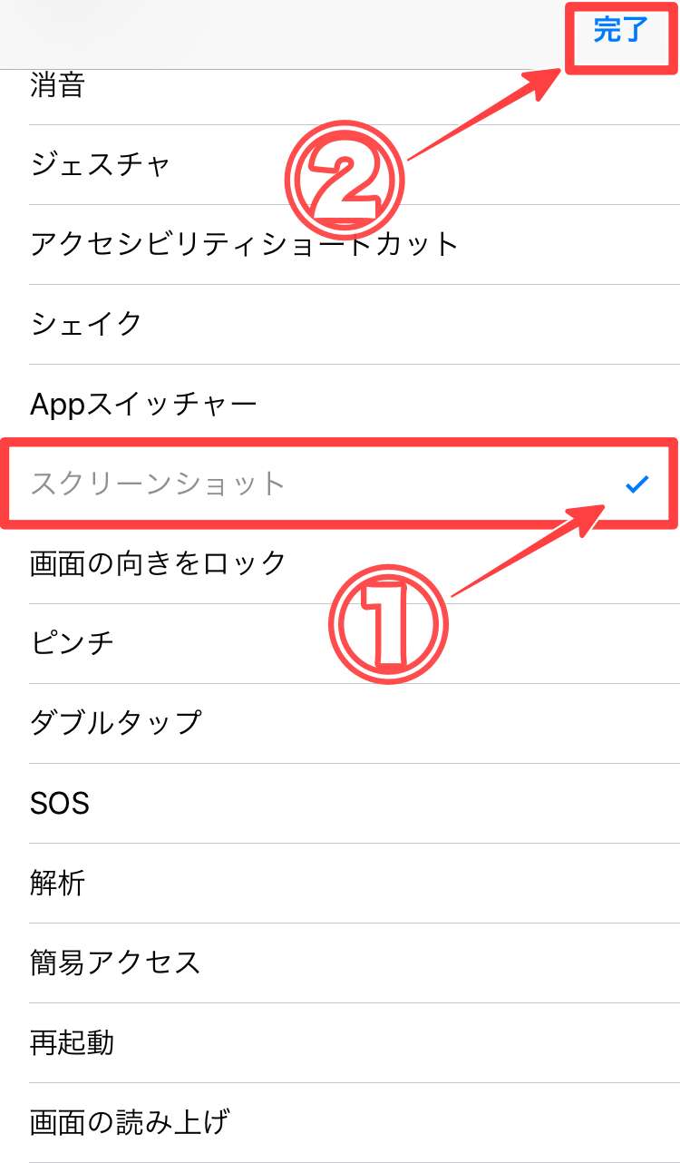 「ー」ボタンをタップしていくと6個のアイコンが一つづつ減るので、最後の1個のカスタムまで消去して、「カスタムボタン」を選択すると、割り当てられる機能一覧が表示されるので「スクリーンショット」を選び「完了」をタップします。