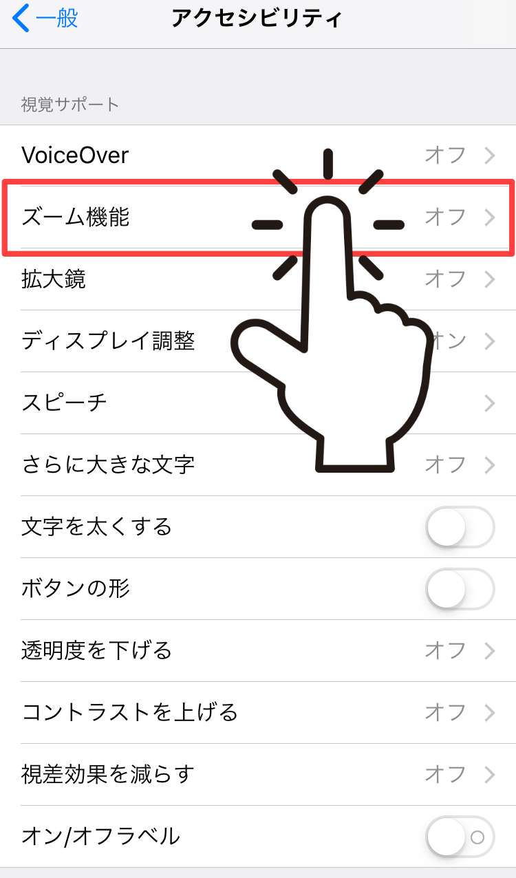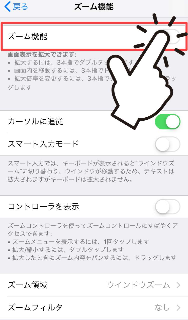 次に、「ズーム機能」>「ズーム機能」をオフで完了です。