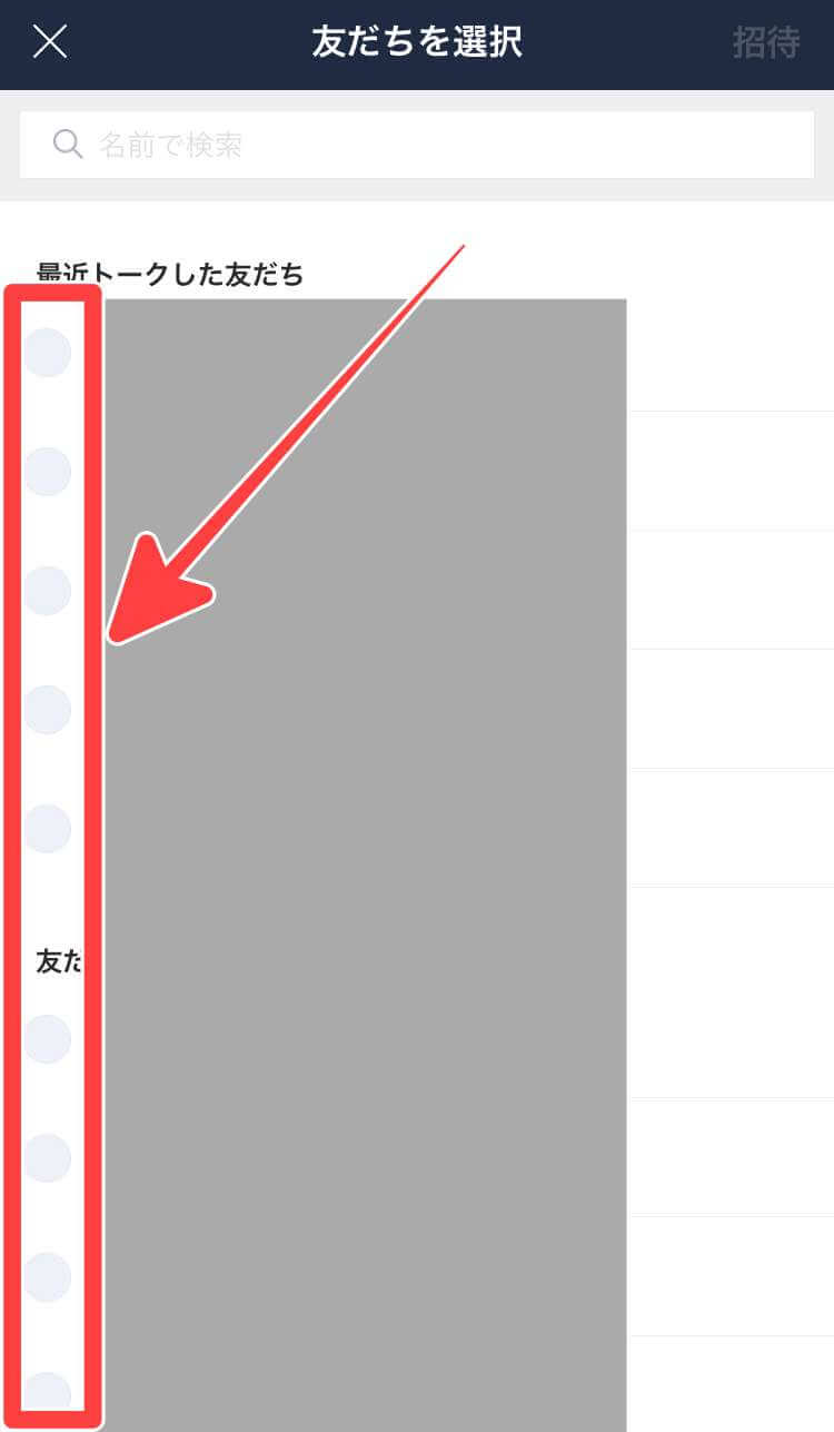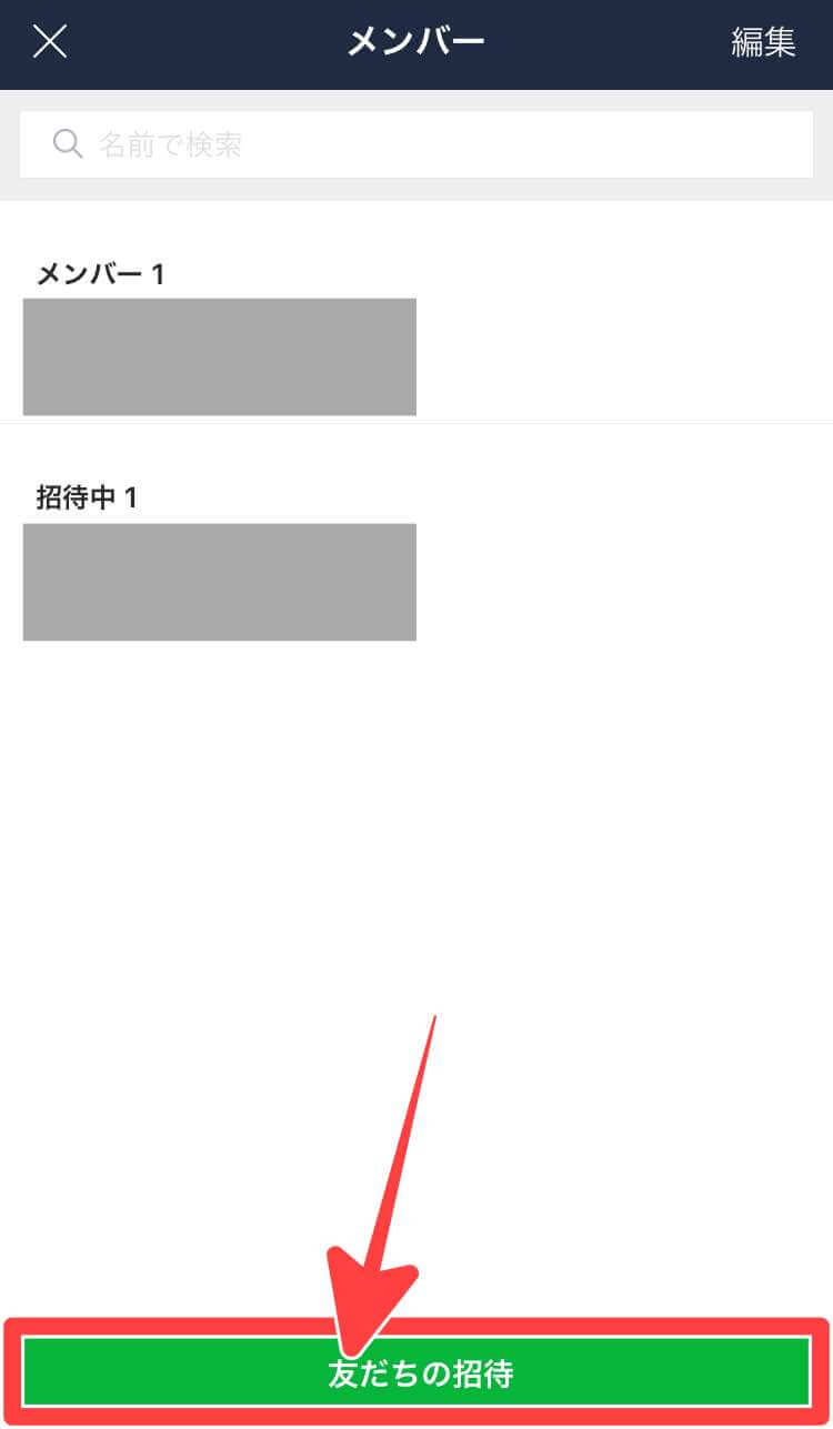 次に現在のメンバー一覧が表示されますのでその画面一番したの「友達の招待」をタップし、追加したい友だちを選択し、最後に右上の「招待」をタップすると追加したい相手に招待が届きます。