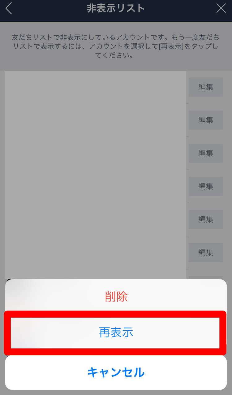 「非表示リスト」に進んで非表示にした友だちの一覧から該当する友だちを選んで「再表示」をタップすれば非表示が解除されます。