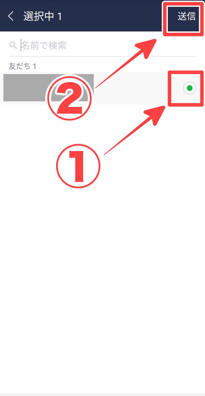 次に友達を選択する画面が表示されますので、対象の友達を選択し、最後に「送信」をタップします。