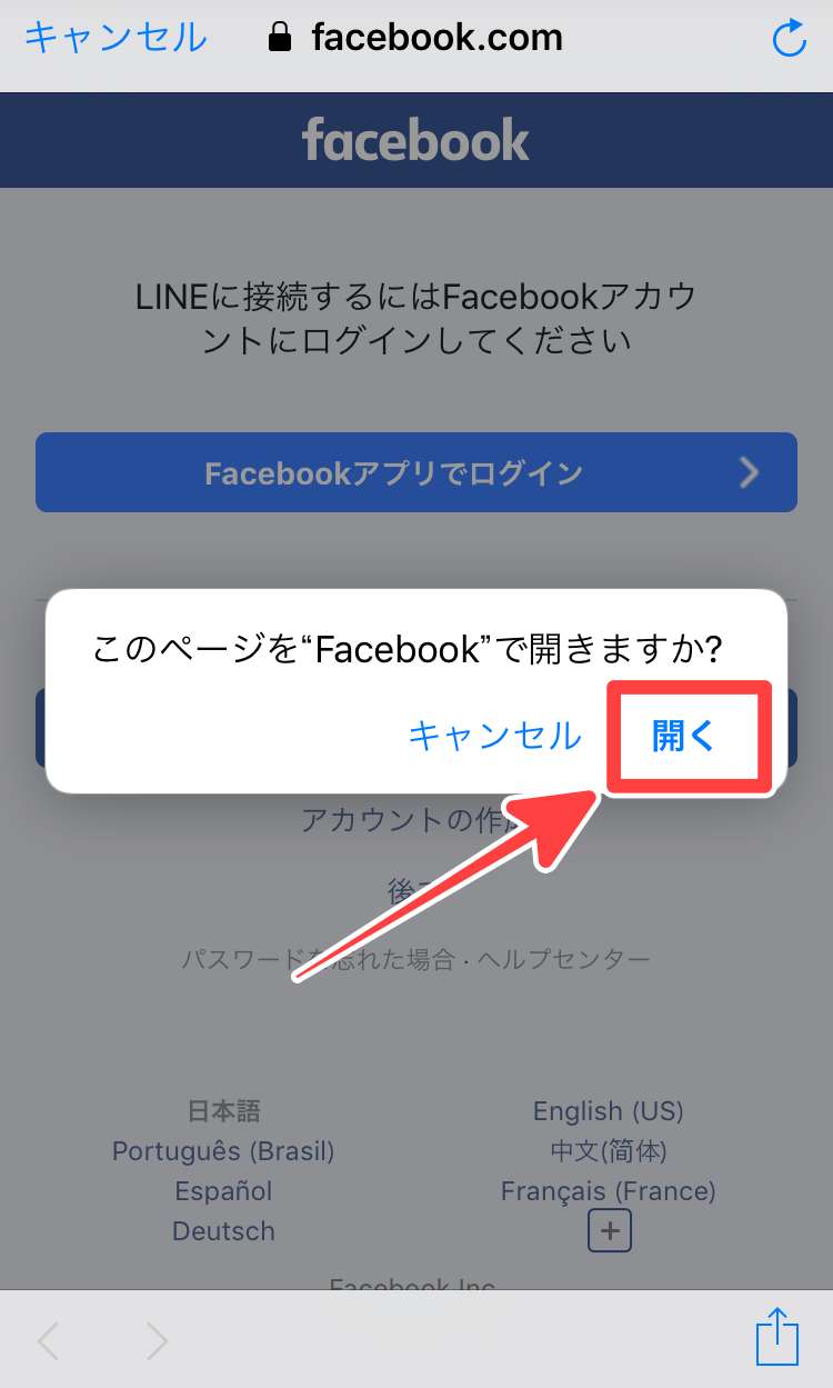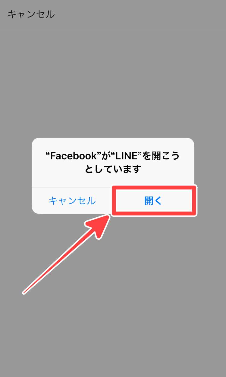 - Facebookが LINEを開こうとしています→「開く」