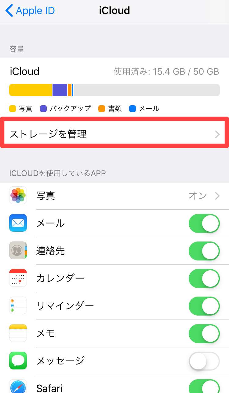 また、「ストレージを管理」をタップすると、今現在iCloudでAppがそれぞれどれくらいの容量を使用しているのかを確認することが出来ます。