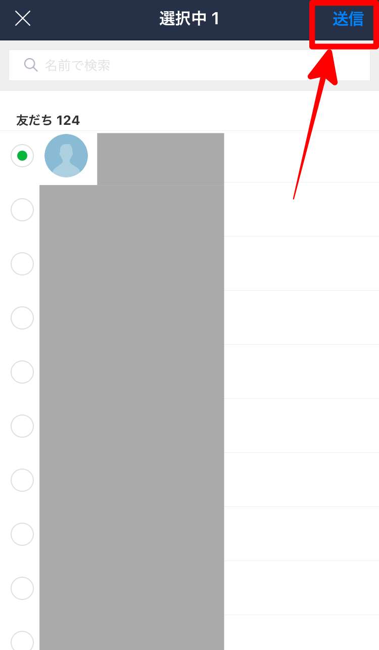 その後、送信したい「友だち」を選択して右上の「送信」をタップすることで相手の連絡先をメッセージに乗せて送信することが出来ます。
