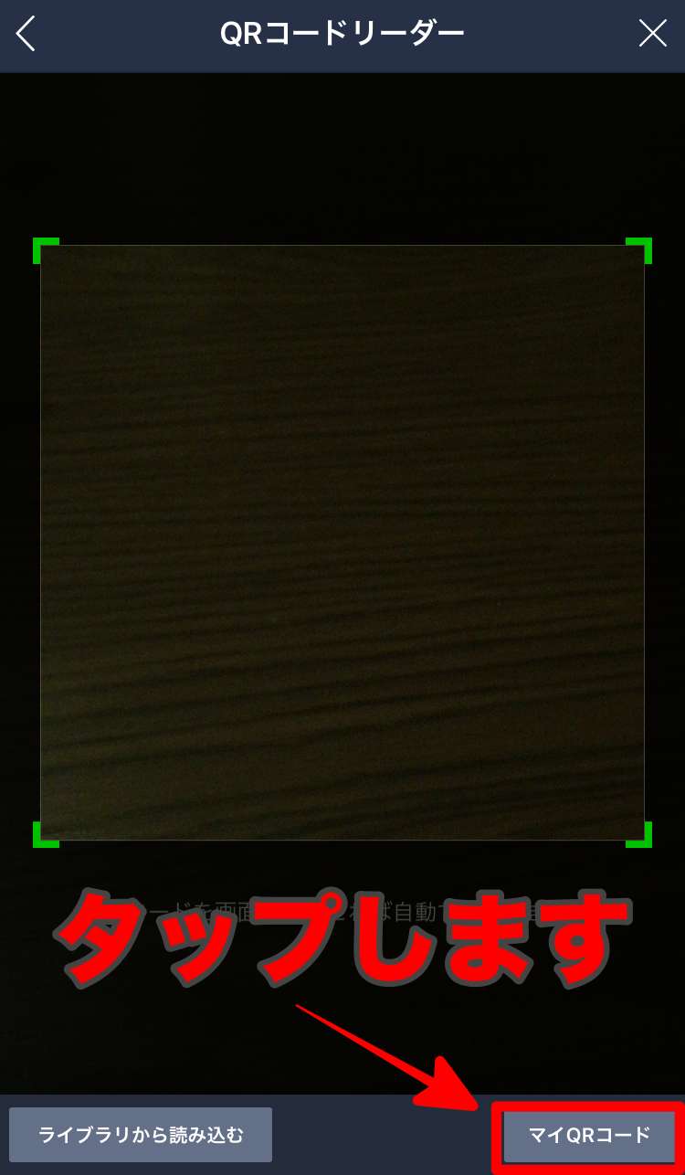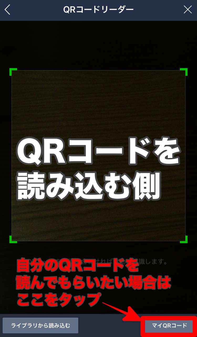 「QRコード」をタップすると以下の様にQRコードリーダーが起動します。読み込む側はこの状態で相手のQRコード読み込みます。