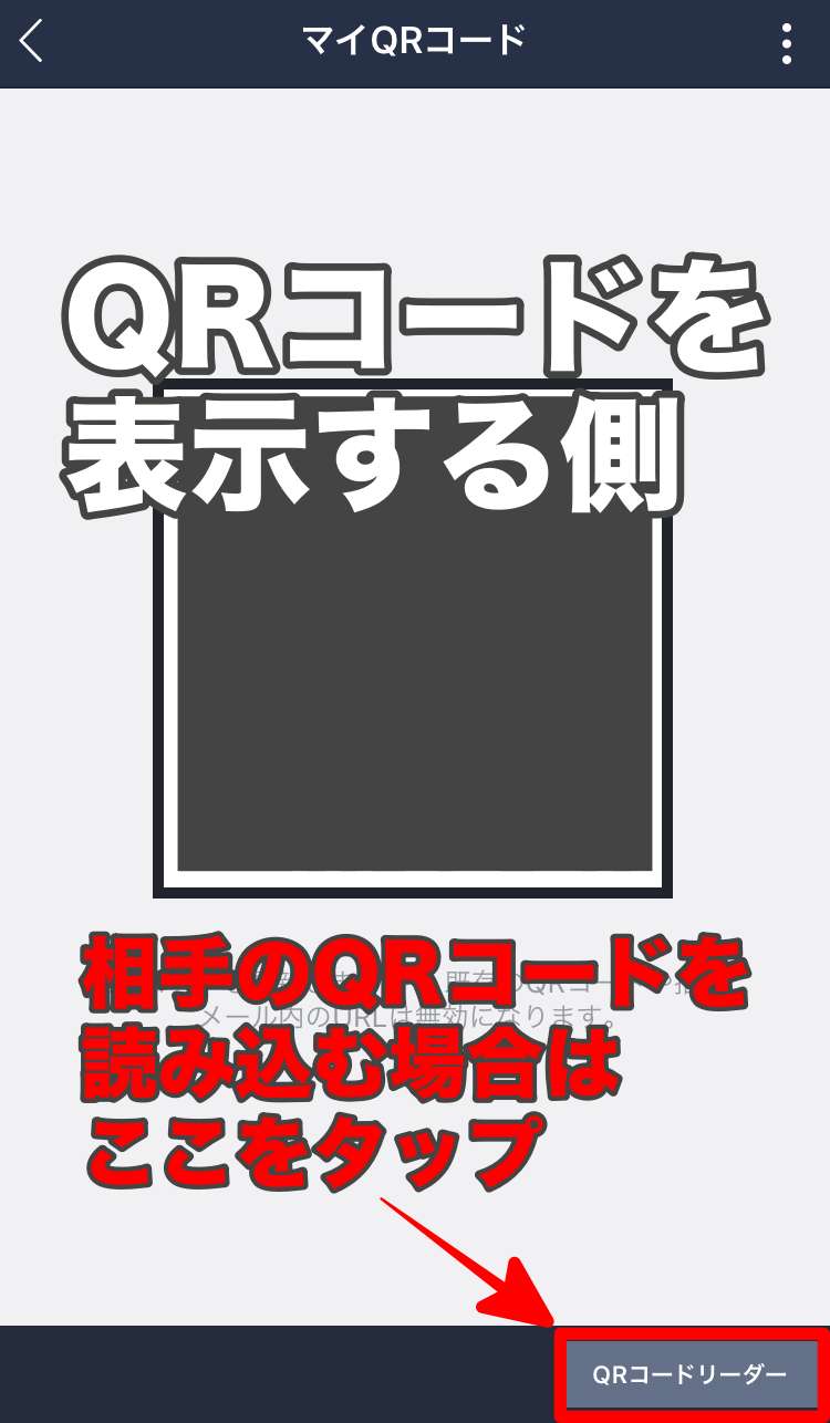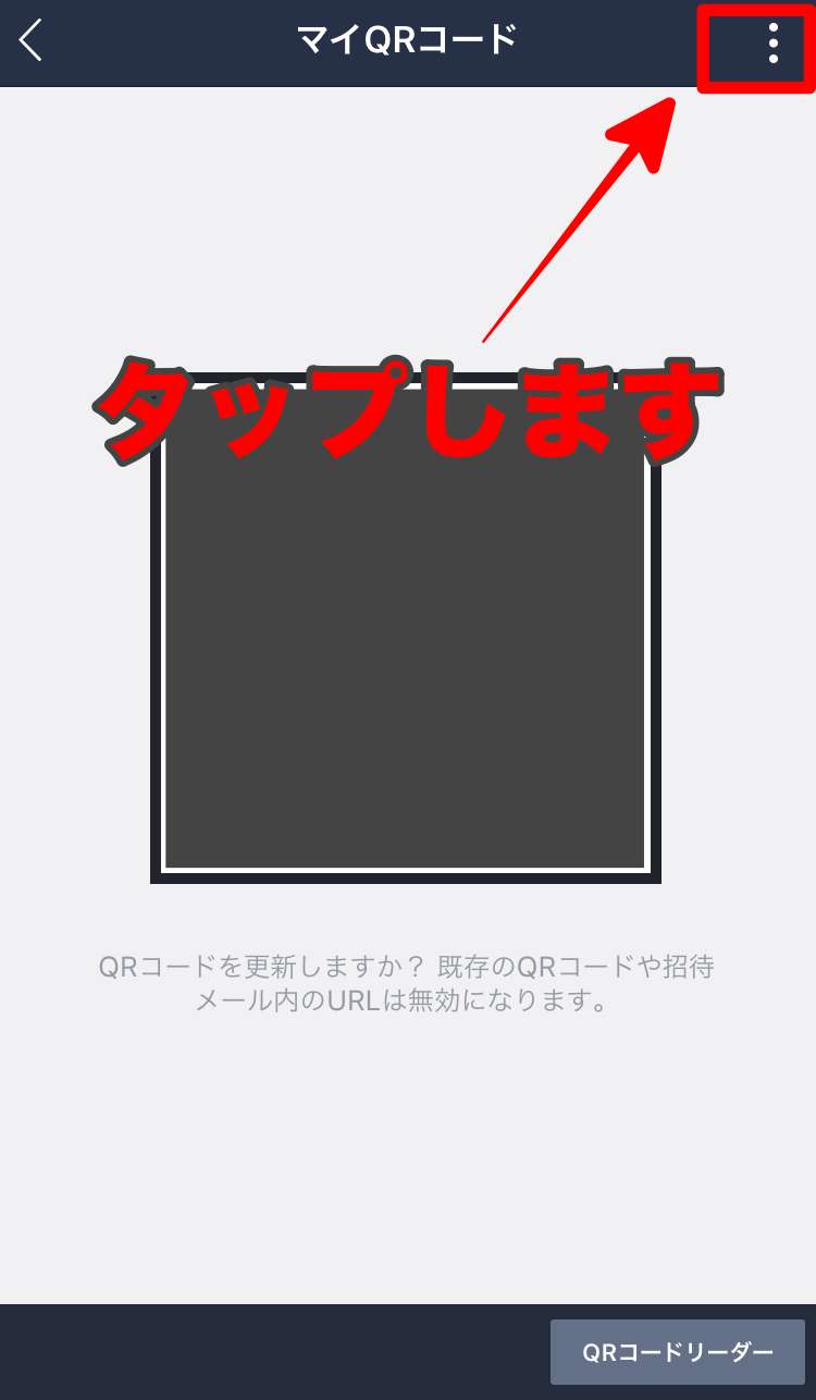 するとQRコードリーダーが表示されますので右下の「マイQRコード」をタップします。その後「マイQRコード」画面の右上の「…」をタップします。