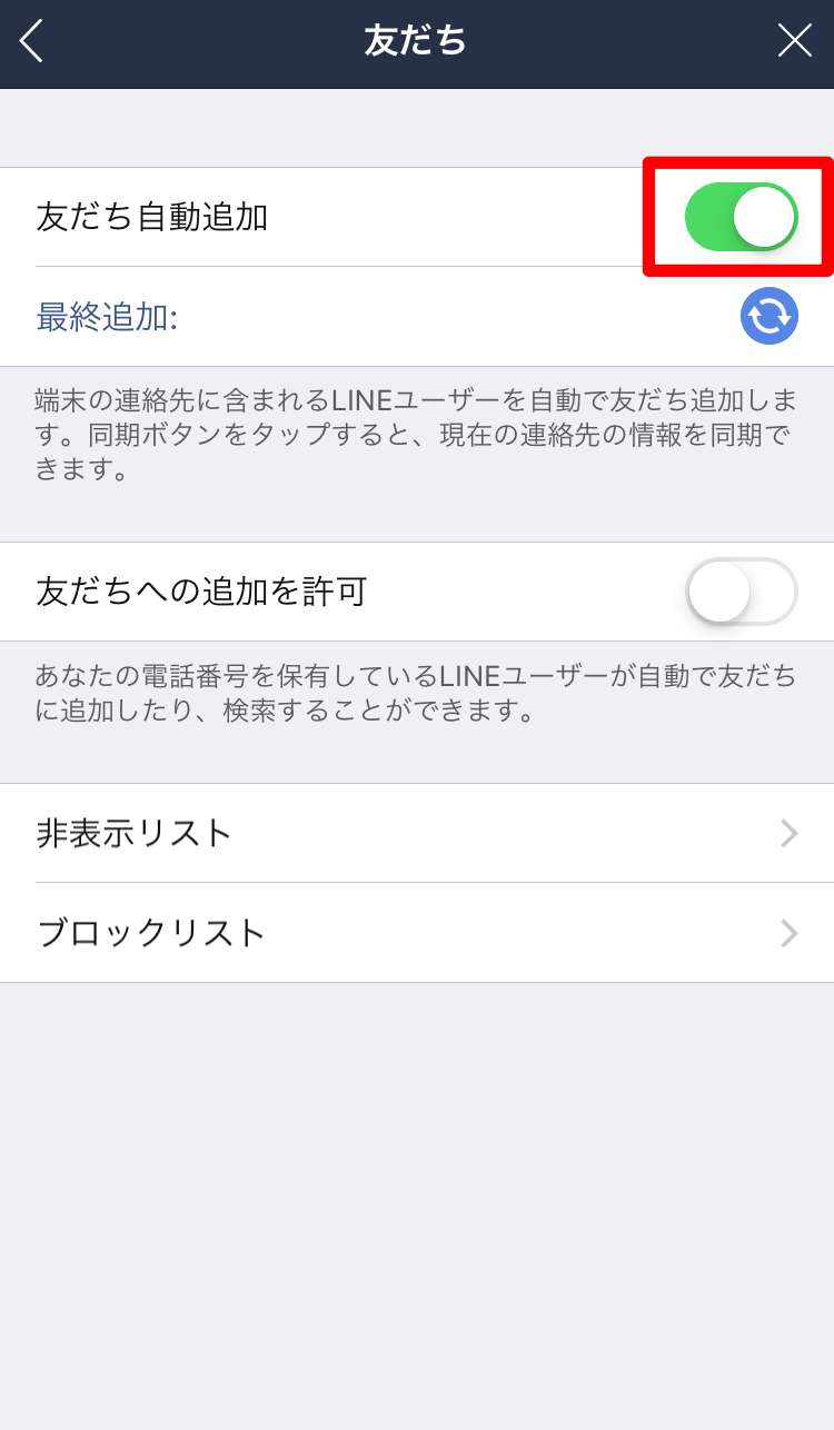 また、「友だちへの追加を許可」をオフにしておくと相手のアドレス帳内にあなたが登録されている場合、自動で「友だち」に追加されます。