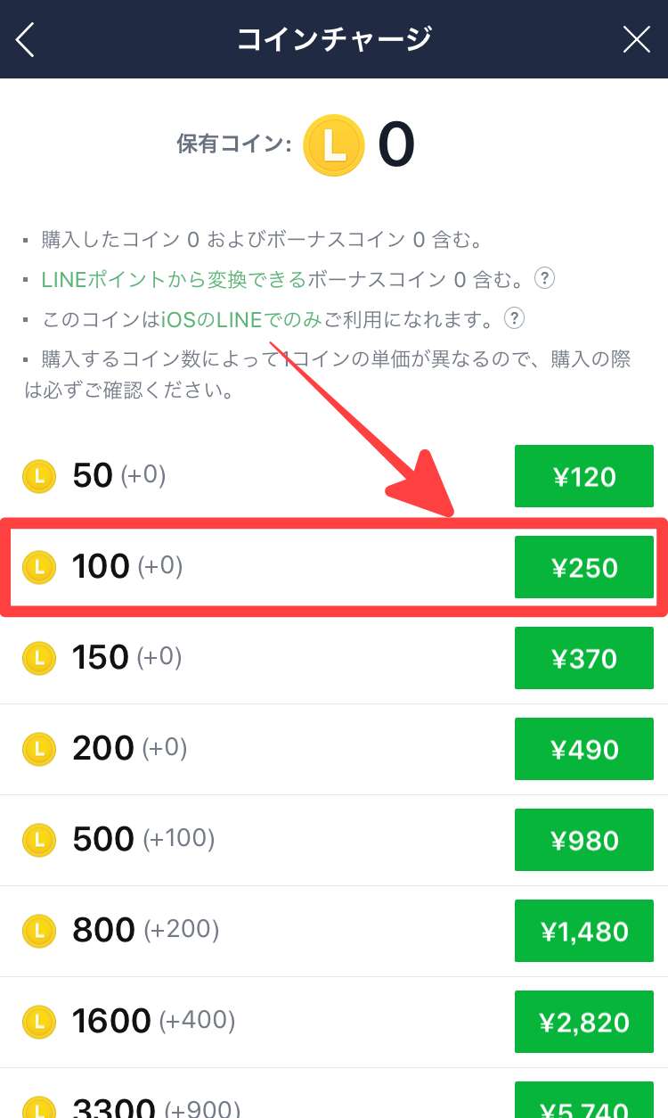 ではここからは実際にApp IDにチャージしたクレジットを利用してLINEコインをチャージしていきましょう。