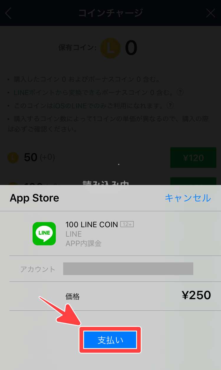 100コイン=¥250をタップするとApp Storeの決済画面が開きますので、「支払い」をタップしてパスワードを入力します。