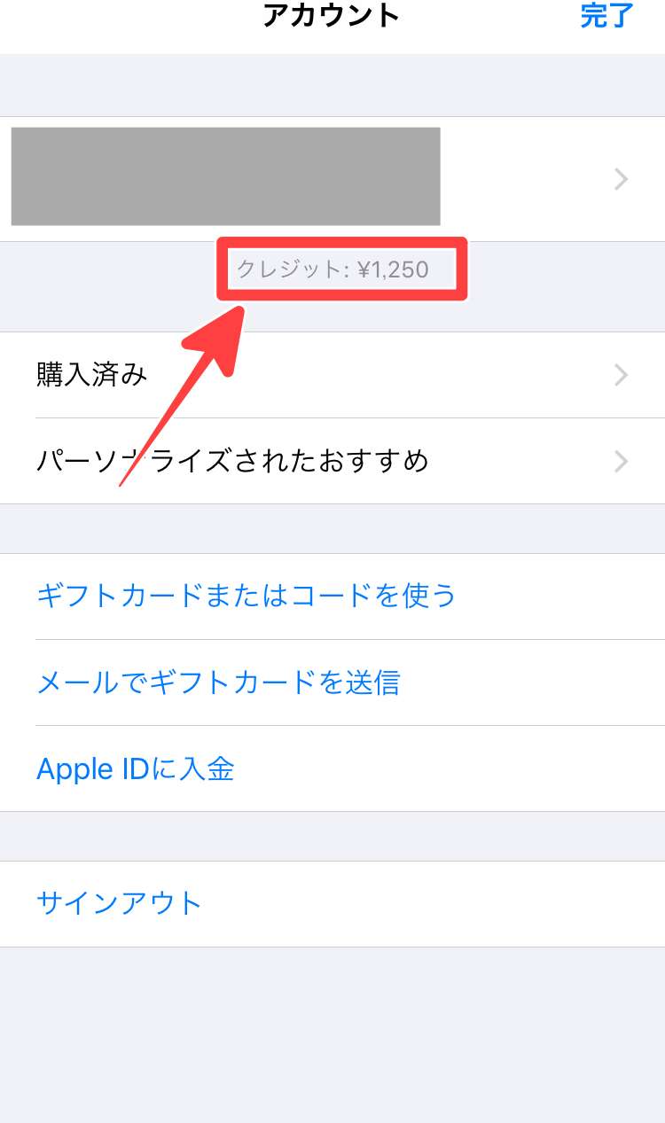 するとApple IDのすぐ下に「クレジット:¥〇〇〇〇」と表記されています。