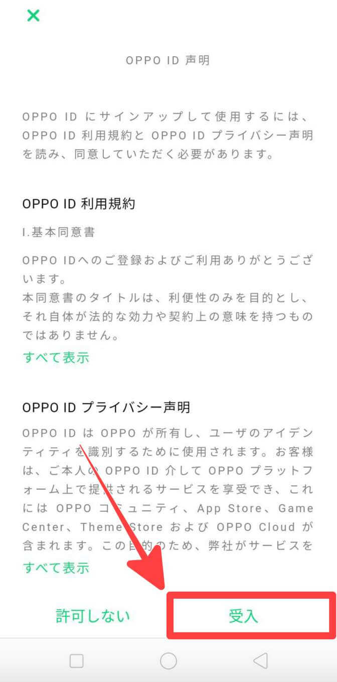 「OPPO ID」画面の「新規ユーザー登録」をタップして「OPPO ID」声明を確認した後に、一番下の「受入」をタップします。