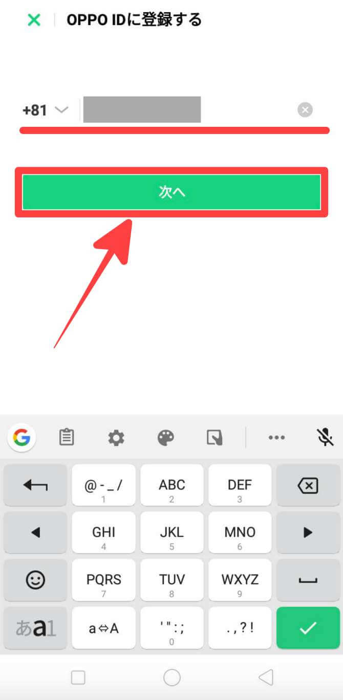 「OPPO ID」声明を確認にしたら電話番号を登録できる画面に変わりますので、ここでOPPO端末の電話番号を入力します。(メールアドレスの場合も)