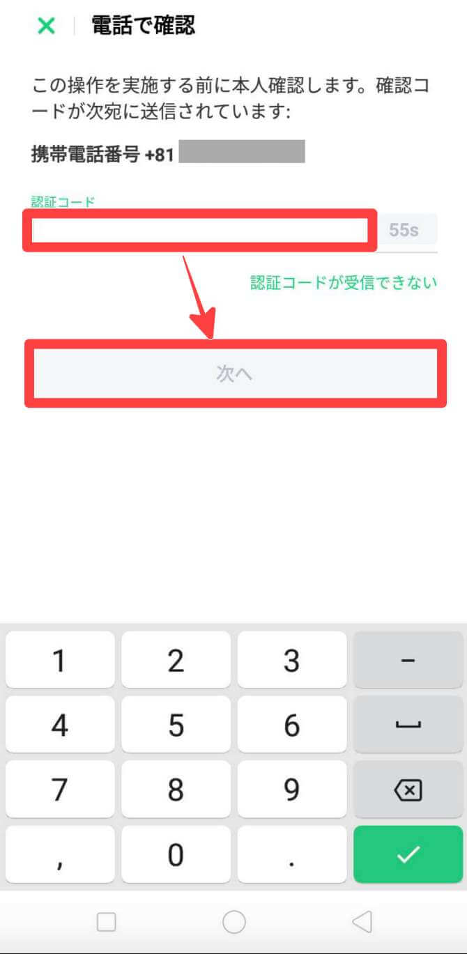 電話番号を入力したらSMSで認証コードが送られてきますので、「認証コード」と書かれたところに送られてきた数字を入力して「次へ」をタップします。