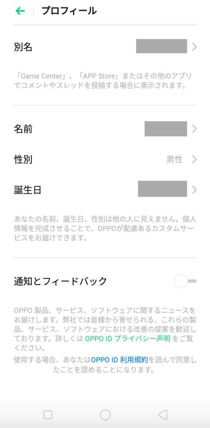 「OPPO ID」のプロフィールと書かれた部分からは、あなたの詳細を「OPPO ID」に登録することが出来ます。